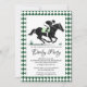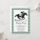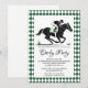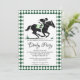 Captura la emoción de la carrera con esta atrevida y deportiva invitación al Derby de Kentucky que presenta una llamativa silueta negra de un caballo galopando y un jinete. Enmarcado por un borde clásico de diamantes verdes (argyle), este diseño enfatiza el espíritu atlético de las carreras de caballos.