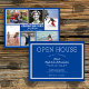 Invitación de graduación del collage de fotos azul marino e invitación a casa abierta. Tarjetas planas de dos caras con seis lugares para compartir fotos del niño o del chica. Las fotos son verticales, horizontales y cuadradas. Las imágenes de su vida pueden mostrar hobbies, talentos, amigos y hermanos favoritos. El centro contiene el texto de "felicitaciones" con su nombre, clase y nombre escolar. Cada foto está enmarcada en blanco. Al fondo, líneas de texto personalizares para la casa abierta, o tu elección de celebración. El color de fondo azul puede cambiarse en el área "personalizar". Asegúrese de cambiarlo por ambos lados de la tarjeta.