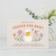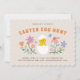 Invitar a amigos y familiares a una festiva cacería de huevos de Pascua con esta dulce y caprichosa invitación a la fiesta. El principal objetivo del diseño es el ilustracion hecho a mano de una polluela nacida de un huevo, rodeada de flores y hojas de colores. La parte posterior de la tarjeta presenta un patrón de puntos simple.