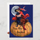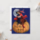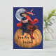 ¡Una dulce imagen vintage de una chica vestida como una adorable bruja abrazando a su gato en una enorme calabaza con la luna llena detrás hace una gran invitación para tu fiesta de Halloween! Simplemente personalizar la parte posterior con los detalles del evento. En la parte trasera también está el gorra festivo de brujas.