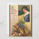 Una tarjeta postal de Acción de Gracias con ilustración vintage que presenta a una mujer y una cornucopia de frutas con el texto "Toda la Abundancia de Acción de Gracias es tuya."