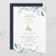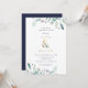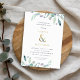 Un personalizado asequible imprimió invitaciones para la cena de boda, personalizadas con los detalles de su evento. Este elegante diseño cuenta con una mezcla de Relieve metalizado dorado y un delicado follaje de color azul y verde sobre un fondo blanco. Utilice las herramientas de diseño para personalizar del texto, editar los tipos de letra y los colores o añadir sus propias fotos para crear una invitación minimalista moderna a los partidos.