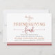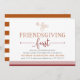 Perfectamente encantadora en los tonos de otoño de ajo y calabaza, nuestra cena de Acción de Gracias invita a los amigos a celebrar "Friendscome" con usted con estilo. El diseño presenta un ilustracion de bellota y hoja en la parte superior con una mezcla de moda de tipografía de bloques y guiones y un borde inferior a rayas en rojo de granate rico.