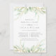 La elegante invitación a cenar con acuarela de color botánico enmarca el ensayo de la ceremonia boda y los detalles de la celebración de la cena con un borde de hojas de acuarela pastel y follaje en tonos pálidos y fríos de verde.