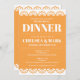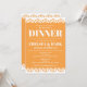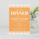 Una invitación a la cena de ensayo al estilo papel picado con un fondo naranja festivo.