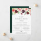 Elegante arreglo floral de acuarela en rojo borgoña, rosa sonrosado y verdes exuberantes, invitación a la cena de ensayo. Diseño de tipografía chic y moderno. La parte trasera de la tarjeta presenta un color verde esmeralda oscuro sólido. Diseñado como parte de nuestra colección floral botánica Burgundy Blush.