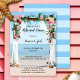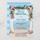 Cena romántica con la imagen de un puerto rosa con velos, con vistas a una playa. Esta invitación es encantadora para una pareja que planea una boda de playa, crucero o destino.