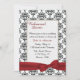 Elegante ensayo de boda, invitación a cenar hecha en un patrón de damasco blanco y negro, con un área de texto blanco enmarcada, en el medio. Gráficos de un lazo y arco rojo bonito, decora la parte inferior de la invitación. El texto en negro y rojo oscuro está listo para personalizar su evento.