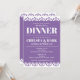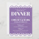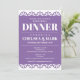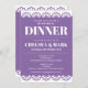 Una invitación a una cena a modo de picado, de estilo papel, con un fondo festivo morado.