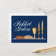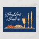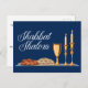 Postal de invitación a la cena de Shabbat Shalom en bello azul con escritura elegante sobre una encantadora cena de Shabbat con pan, vino y velas. Que tengas muchas bendiciones. Personalice la parte de atrás con su cena judía invitando detalles.