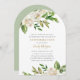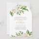 Personalizado asequible imprimió invitaciones de confirmación con un elegante borde floral pintado con acentos de Relieve metalizado blanco, verde y falso oro. Personalice la plantilla con los detalles del evento o utilice las herramientas de diseño para personalizar del texto, elija los colores de fondo y edite los tipos de letra para crear su propio diseño de invitación único. En el lado inverso se muestra un fondo verde de bonito o se utiliza el espacio para agregar texto o fotos adicionales si es necesario. Este bonito diseño floral neutro es perfecto para cualquier temporada.