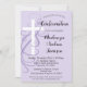 Invitación a la confirmación de lavanda de bonito con una cruz blanca con remolinos morados que la rodean.