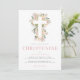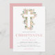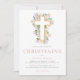 Una elegante invitación para tu bautizo con una niñita con flores rosadas bonito y hojas verdes detrás de una cruz blanca. Personaliza tus detalles en rosa y gris.