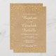 Los corazones dorados bautizan la invitación. Con un fondo rústico al estilo de papel kraft, los corazones dorados se confetti y la preciosa caligrafía de escritura con una sombra de gota de oro. Al revés se ve un confetti de corazones dorados.
