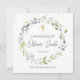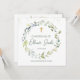 Este diseño presenta un ilustracion de hojas de follaje verde y eucalipto al estilo de las acuarelas. En la parte superior de la tarjeta se ve una imagen de confeti de cruz y efecto dorado/verdoso.
