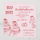 Invitación a la despedida de soltera roja y rosa con champán, pastel y anillos