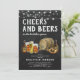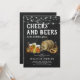 Invitaciones rústicas de despedida de soltero con un efecto de pizarra en el fondo, una selección de cervezas de acuarela, pretzel y un barril de cerveza, luces de cuerda, y una plantilla de fiesta moderna "cheers and beers" que es fácil de personalizar.