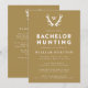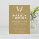 Invite a sus invitados a una cacería o fin de semana para celebrar al futuro novio con estas invitaciones de despedida de soltero con temática de caza. Este diseño presenta cuernos y un monograma, con texto totalmente editable en la parte delantera y trasera de la invitación. Ya sea que su viaje sea un fin de semana, un viaje de dos días o algo más grande, puede personalizar este diseño para satisfacer sus necesidades.