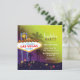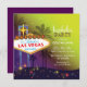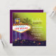 Hermoso letrero de Las Vegas + estrellas coloridas y glitzy y siluetas de palmeras altas + fondo amarillo y morado ilustrados en invitaciones personalizadas para despedida de soltero. Tarjeta de invitación única y elegante que puedes personalizar completamente para tu próxima despedida de soltero o despedida de soltera en Las Vegas. (Puedes encontrar los artículos y detalles de boda a juego en esta tienda, Bridal Heaven. Contacta con ujean4791@gmail.com para trabajos personalizados y/o papelería de boda coordinada.)