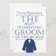 ¡Es su último hurra antes de sentar cabeza! ¿Por qué no empezar las festividades con una invitación divertida y genial que les haga saber a todos que el invitado de honor es... el novio más interesante del mundo? Esta invitación de despedida de soltero para el novio más interesante en azul oscuro presenta un diseño de texto en negrita y un esmoquin elegante. Fácil de personalizar, simplemente agregue los detalles de la loca y salvaje fiesta que tiene planeada en los campos proporcionados. Haga clic en el botón "Personalizar" para encontrar opciones de personalización adicionales.