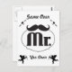 Invitación con bigote. Simplemente haga clic en editar/personalizar y agregue sus detalles haciendo clic en el botón de agregar texto en la parte superior izquierda de la herramienta de diseño. Diviértase agregando tipografía personalizada a esta divertida postal de boda retro cottagecore. O utilícela como tarjeta de accesorio de foto divertida para el día de la boda para el novio y los invitados para tomar muchas fotos divertidas para todos.