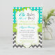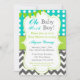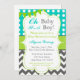 Invite a sus huéspedes a su ducha de bebé de una manera divertida con esta invitación personalizada de chevron y polka gris, azul y verde.