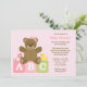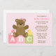 Esta tierna invitación de Baby Shower incluye un oso de peluche con un arco rosado y un pato de goma y una sonrisa sentada encima de bloques ABC. Esta moderna y divertida invitación a la ducha de bebé es perfecta para cualquier madre.