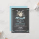 Invitación con tambor sobre fondo de tiza y tono azul bebé.