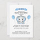 Invitación a la ducha para bebés con temática de elefantes con globos y elefante azul en el frente y fondo gris claro. Personalizar a tu gusto y haz especial tu día.