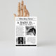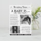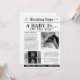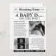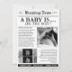 Una encantadora ducha de bebé al estilo de un periódico invita a tomar dos fotos de personalizable en blanco y negro. Incluye una sección para detalles del evento (fecha, ubicación, RSVP) y un sincero párrafo de "Esperando por el bebé" para compartir su alegría de una manera atemporal y personal.