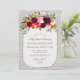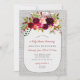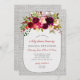 La invitación a la ducha de bebé con jarra de carmín de albañil floral de Borgoña incluye un rústico borregal blanco, un frasco de albañil y flores de color burdeos de color agua. ¡Qué lindo!