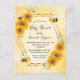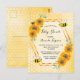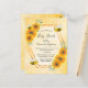 Elegante, divertida invitación a la ducha de bebé, neutral en género. Fondo amarillo con un patrón dorado de panal de miel. Con un marco geométrico de oro falso. Flores amarillas, naranjas y abejas felices. Con el texto: Baby Shower y el nombre de la mamá para estar en el frente escrito con un moderno guión de estilo con letras a mano. Cartas negras. Espalda: patrón de panal amarillo. Sugerencia: Si no desea que se vea como una postal, haga clic en personalizar, vaya a la parte posterior y quite el separador y el sello postal.