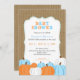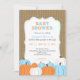 Rústica invitación a la ducha de bebé de un niño de otoño con un falso marco de burlap y un montón de calabazas en azul, naranja y blanco. También hay otros colores y una versión de Baby Sprinkle.
