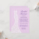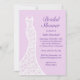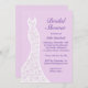 Un vestido de boda de encaje bonito acentúa esta invitación a la ducha de novia con un fondo suave y violeta. Esta invitación se muestra en el papel básico; sin embargo, recomiendo el peso y textura del papel de lino.