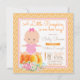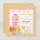 Pequeña invitación a la ducha de calabaza con una adorable bebé usando un lindo traje rosado sentado en una calabaza sobre un fondo rosa y naranja de chevron. Puede fácilmente personalizar estas adorables invitaciones de ducha de bebé rosa y naranja para su evento simplemente agregando sus detalles.