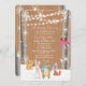 ¡Celebremos a la niña en el camino! Escena de invierno rústica con fondo de grano de madera marrón, elegante, moderna y de invierno, tema fiesta de ducha de bebé con copos de nieve, nieve, luces de cuerda, animales y abedules. Hay un búho en el árbol con un cartel que dice: "¡Es un Chica!" Perfecto para celebraciones de invierno y duchas para bebés. Personalice con su fiesta la información de todo el texto es completamente personalizable.