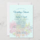 Una ducha tropical temática para la novia y el novio. Flores hawaianas y piñas invitan a una pareja a bañarse en una boda con personalizados. Texto azul en escritura elegante y fuentes modernas impresas sobre un fondo azul claro con una gran imagen de flores tropicales y dos piñas. El inverso tiene un patrón de piña.