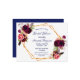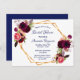 Delante: fondo blanco con un marco falso de forma geométrica de oro. Decorada con flores oscuras de color burdeos y rosa, rosas y plumas de estilo boho. Plantillas para el nombre de la novia y los detalles del fiesta. El nombre está escrito con un guión de estilo con letras a mano, letras de color borgoña. Fondo azul marino.
