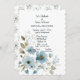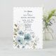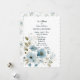 Una invitación a la ducha de novia floral azul bonito con todos los detalles sobre un fondo blanco Una floral azul realza el borde inferior izquierdo, con un patrón de la misma floral que cubre la parte posterior.