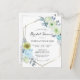 Celebra con tus amigos cercanos en tu ducha de novia y los invitas con esta postal de invitación a la ducha de novia floral azul. Este diseño presenta un bonito marco geométrico dorado con ramos florales de color agua suave con rosas y hortensias en azul y blanco roto. Delicado guarnecido botánico con hojas azules complementa perfectamente esta encantadora ducha de novia.