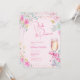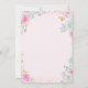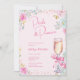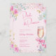 Invitación a la ducha de novias Petals & Prosecco con fondo de color de color claro y chispas rosas, flores moradas y azules rosas y escritura caligráfica rosa. Una cinta de coqueta rosa dulce atada alrededor de la flauta de champán.