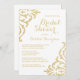 Esta elegante y vintage ducha de novios cuenta con un delicado adorno de damasco dorado con un fondo blanco.