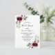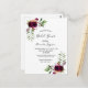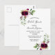 Delante: Decorada con flores de color burdeos oscuro, rosas, plumas de estilo boho y vegetación. Un elegante fondo blanco. Plantillas para el nombre de la novia y detalles del fiesta. El nombre y el texto: Bridal Shower están escritas con un guión de estilo con letras a mano, letras de color borgoña. Fondo blanco y rosas.