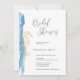 El diseño de la invitación a la ducha marrón con temática oceánica incluye un caballito de mar y un efecto de pincel de agua azul del océano en el borde.