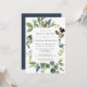 La elegante invitación a la ducha botánica nupcial enmarca los detalles de tu ducha de novia con un borde de hojas de eucalipto de color agua, flores azules y follaje verde. Invitaciones reversas a azul marino sólido.