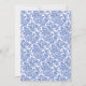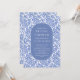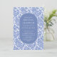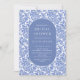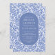 Patrón moderno y elegante del damasco con un elegante óvalo que enmarca la información de su fiesta en azul y blanco.