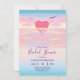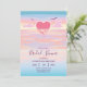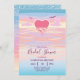 Bonita invitación personalizada en suaves colores pastel. El romántico paisaje del amanecer con un sol rosa en forma de corazón. Un entorno de lujo frente al mar para una boda perfecta en la playa o un boda de la isla de destino.