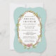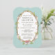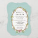 Una corona delicada de ramas de bosque y flores dulces rodea esta invitación a la ducha bonito en suave belleza natural. En suaves tonos pastel de verde azulado, rosa, marfil y verde primavera, este original ilustracion de Kat Parrella es perfecto para un fiesta de jardín, un fiesta de té, primavera, una ducha exterior o de patio trasero. Cada línea es personalizable para su comodidad.