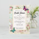 Una invitación a una ducha de novia. "Bridal Shower" escrita con un tipo de letra de guión moderno. Diseñado con mariposas brillantes rosas y verdes revoloteando por ahí. El fondo es un collage vintage de mal gusto con rosas rosas rosas y otros elementos decorativos. Un marco color crema con un borde dorado sobre la parte superior donde puedes añadir la información de tu fiesta. Una moda anticuada.