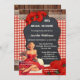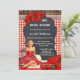 Una romántica invitación a la ducha de novias con un tema de barbacoa, con madera rústica, pizarra, un cuadro vintage de una mujer vestida de rojo, flores de amapola y encaje sobre un fondo de gingham. La parte trasera es una combinación de madera rústica con encaje sobre un patrón de gingham rojo y marfil.